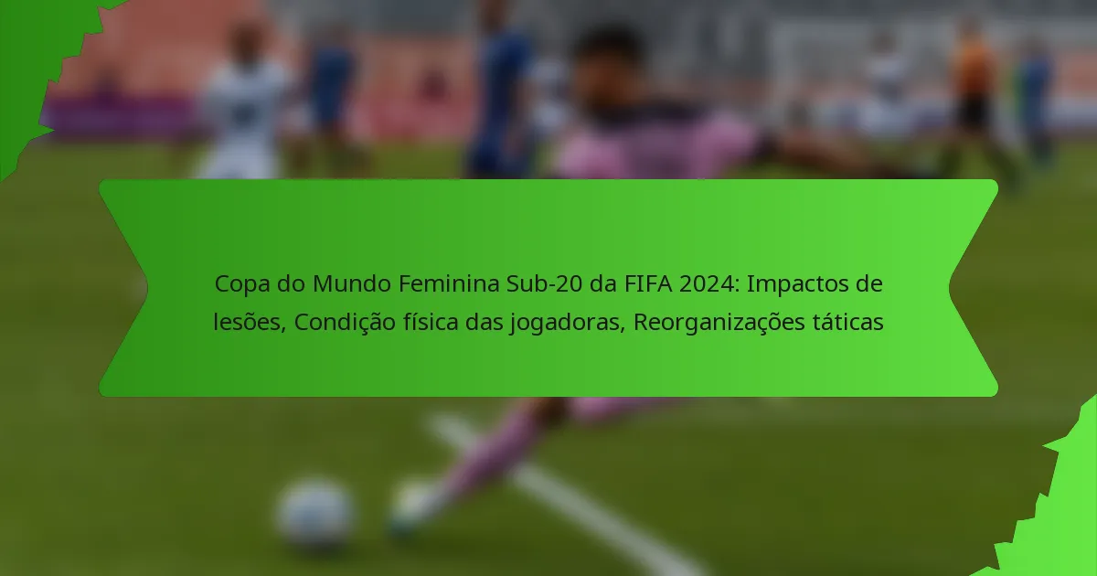 A Copa do Mundo Feminina Sub-20 da FIFA 2024 é fortemente influenciada por lesões, que podem alterar drasticamente a dinâmica das equipas e as estratégias táticas. À medida que jogadoras-chave das principais equipas enfrentam contratempos, a sua ausência não só afeta a moral da equipa, mas também exige ajustes significativos nas formações e planos de jogo. Além disso, a condição física das jogadoras continua a ser um fator crucial, com equipas que apresentam níveis de fitness mais elevados a desempenharem-se geralmente melhor em campo.